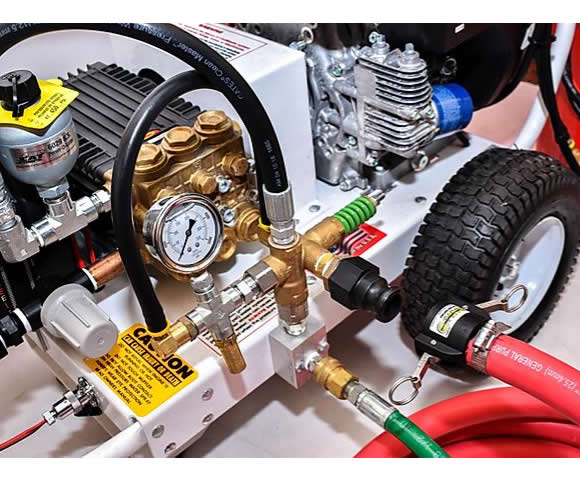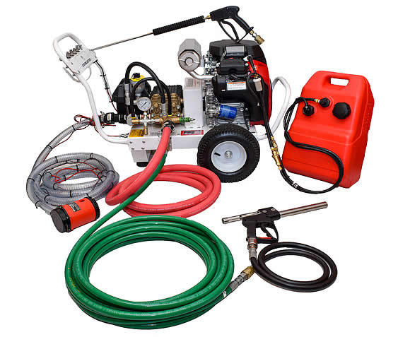 CaviDyne’s very popular commercial unit is a compact and lightweight cleaning system, yet produces superior performance by using ultra-cavitation. The predecessor to this Model, operating at a mere 2200 psi, is documented to out-clean a 6,500 psi water blaster system. The Model 1228 Series are also available with electric motor drivers.